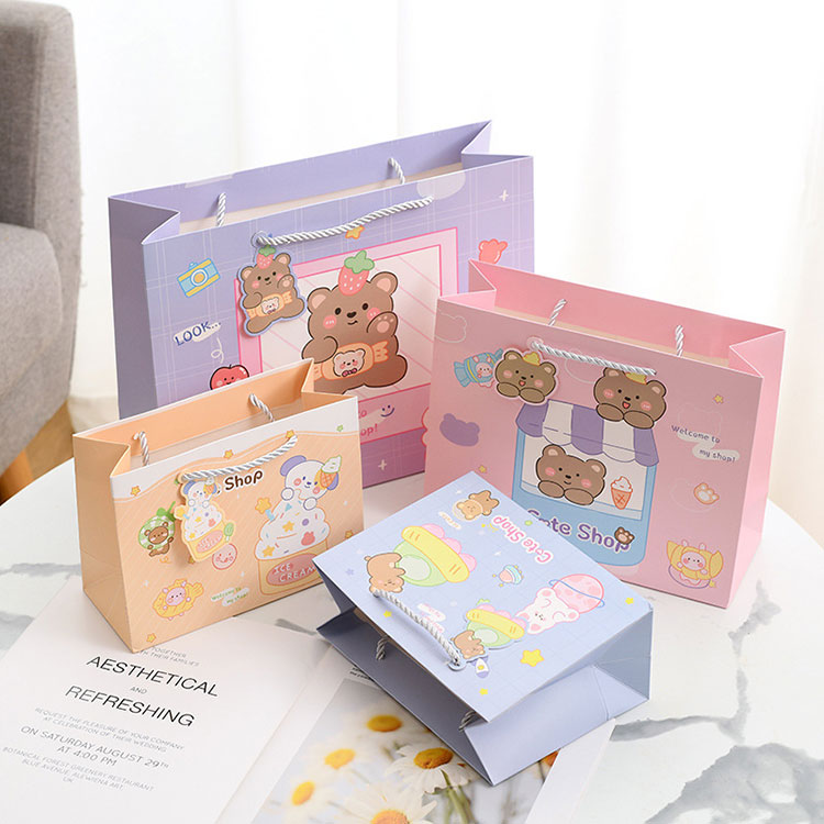 Ang ilalim ng Cartoon Gift Paper Bags ay mahigpit na naka-gum, na hindi madaling basagin. Gumagamit kami ng puting kraft paper para gawin ito at maaari itong masira. Sa pinalakas na hawakan, mayroon itong malakas na kapasidad ng tindig.