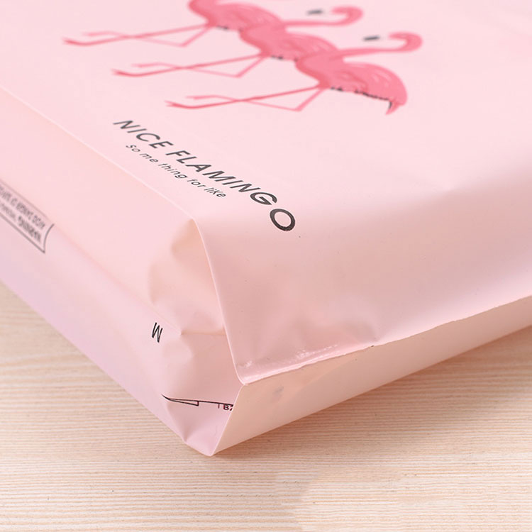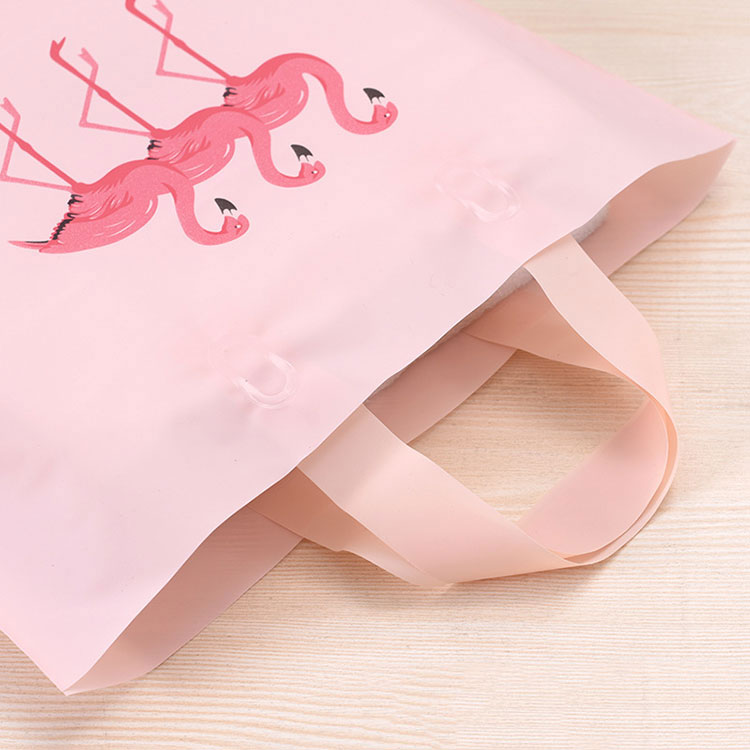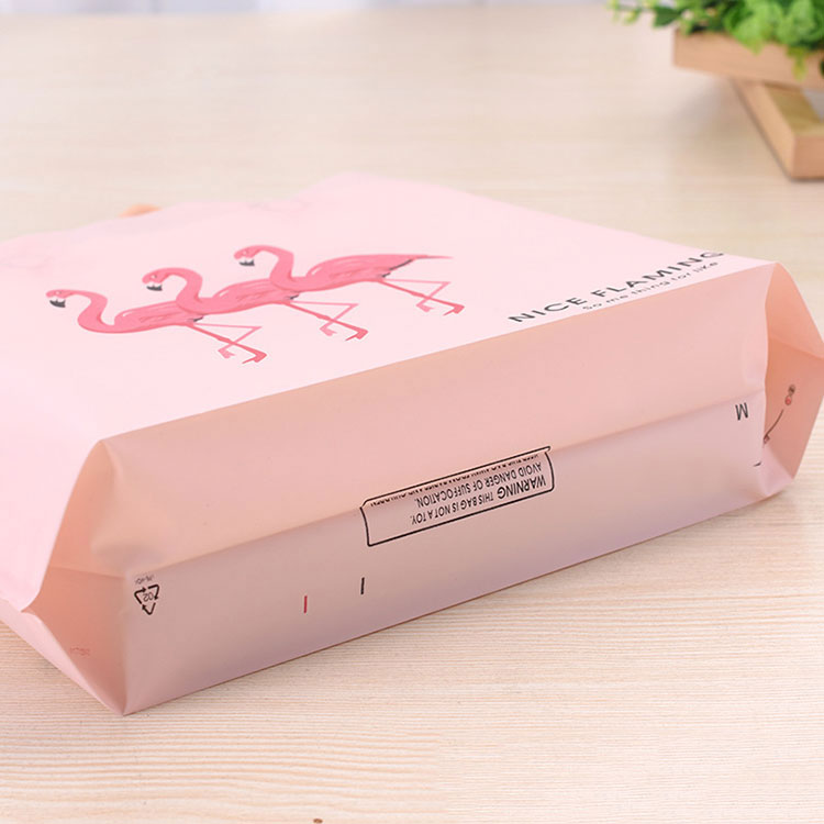 Ang bag ng ThePe na may hawakan ay nakalimbag na may tatlong flamingos. Ang kanilang kulay ay kulay rosas, habang ang bag ay light pink. Ang dalawang kulay na ito ay tumutugma sa bawat isa. Mayroon ding ilang mga salita sa ibabang kanang sulok. Kung nais mong ipasadya ang iyong sariling pattern o slogan, maaari kaming makagawa ng mga bag ng PE ayon sa iyong mga kinakailangan.
